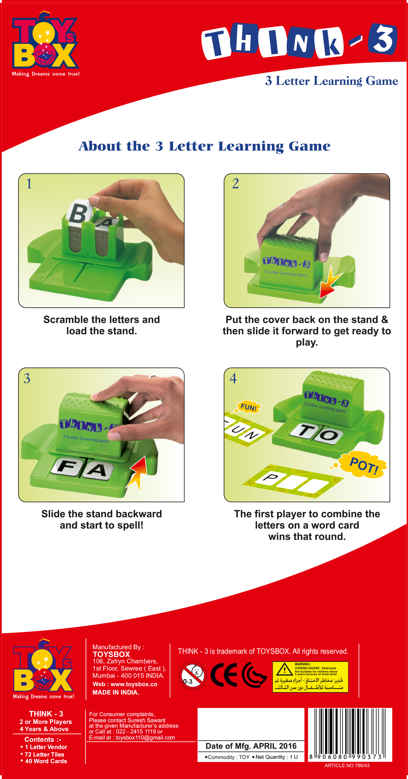 Подумай-3Артикул: 786/43 Описание: Отмеченная наградами 3-буквенная игра в словообразование, чтобы дать вашим малышам правильное начало. Содержимое: 1x пластиковая подставка, 72x буквенная плитка, 40x карта слов Возраст - 3+