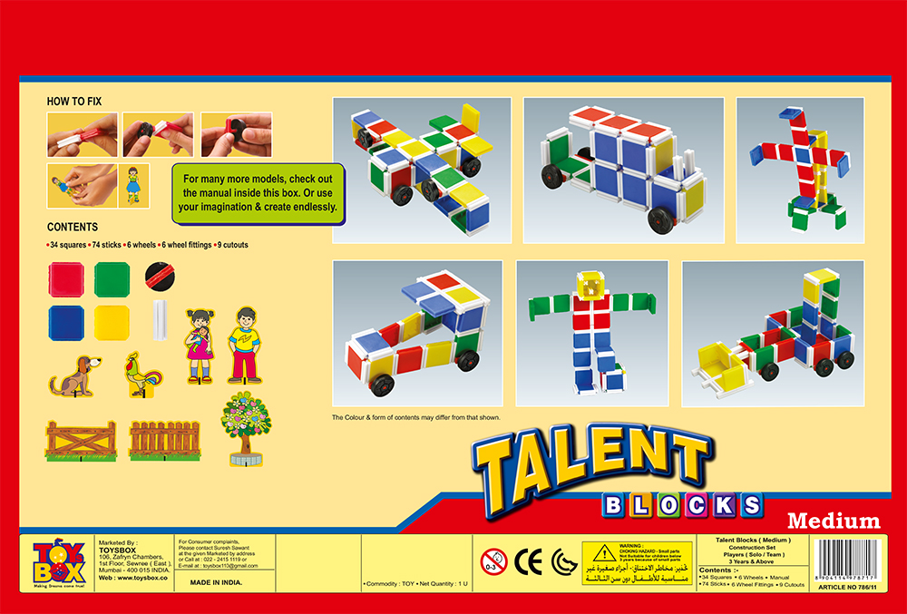 Талант - Блочный конструктор(средний)Артикул: 786/11 Описание: Пластиковый конструктор, который поднимает творческий потенциал вашего ребенка на новый уровень. Содержимое: 34 квадрата, 74 стика, 6 колёс, 6 колёс, 5 вырезов - вы можете сделать - 31 модель. Итого - 120 шт. Возраст - 3+