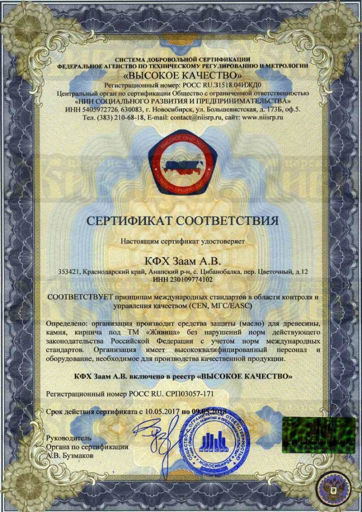 Компания «Живица» на данный момент является производителем натуральных красок без химии №1 в России. Под брендом «Живица» компания на рынке масел для дерева с ноября 2015 года. Организация является производителем красок без химии №1 в России, осуществляет производство масел и пропиток из возобновляемого природного сырья в соответствии с требованиями международных форм и законодательства РФ по качеству и надежности производимой продукции; компания «Живица» вносит заметный вклад в развитие строительной отрасли. «Живица» постоянно работает над качеством своей продукции – в 2017 году компания признана производителем красок без химии N1 в России! Сертификат соответствия выдан Центральным органом по сертификации «НИИ СОЦИАЛЬНОГО РАЗВИТИЯ И ПРЕДПРИНИМАТЕЛЬСТВА». Включено в реестр «ЛИДЕР ОТРАСЛИ». Все масла и колера компании «Живица» производятся из 100% природных ингредиентов: льняное масло, тунговое масло, скипидар живичный, сосновая смола (живица), карнаубский воск, микровоск и минеральные компоненты. Масла проходят лабораторные проверки и имеют широкую сферу применения – обработка посуды, детских игрушек, мебели, стен и потолков внутри помещения, бань, саун, а также масла для наружных работ с усиленной защитой от агрессивного атмосферного воздействия (дождь, перепады температуры, ультрафиолет, грибок и воздействие насекомых вредителей).