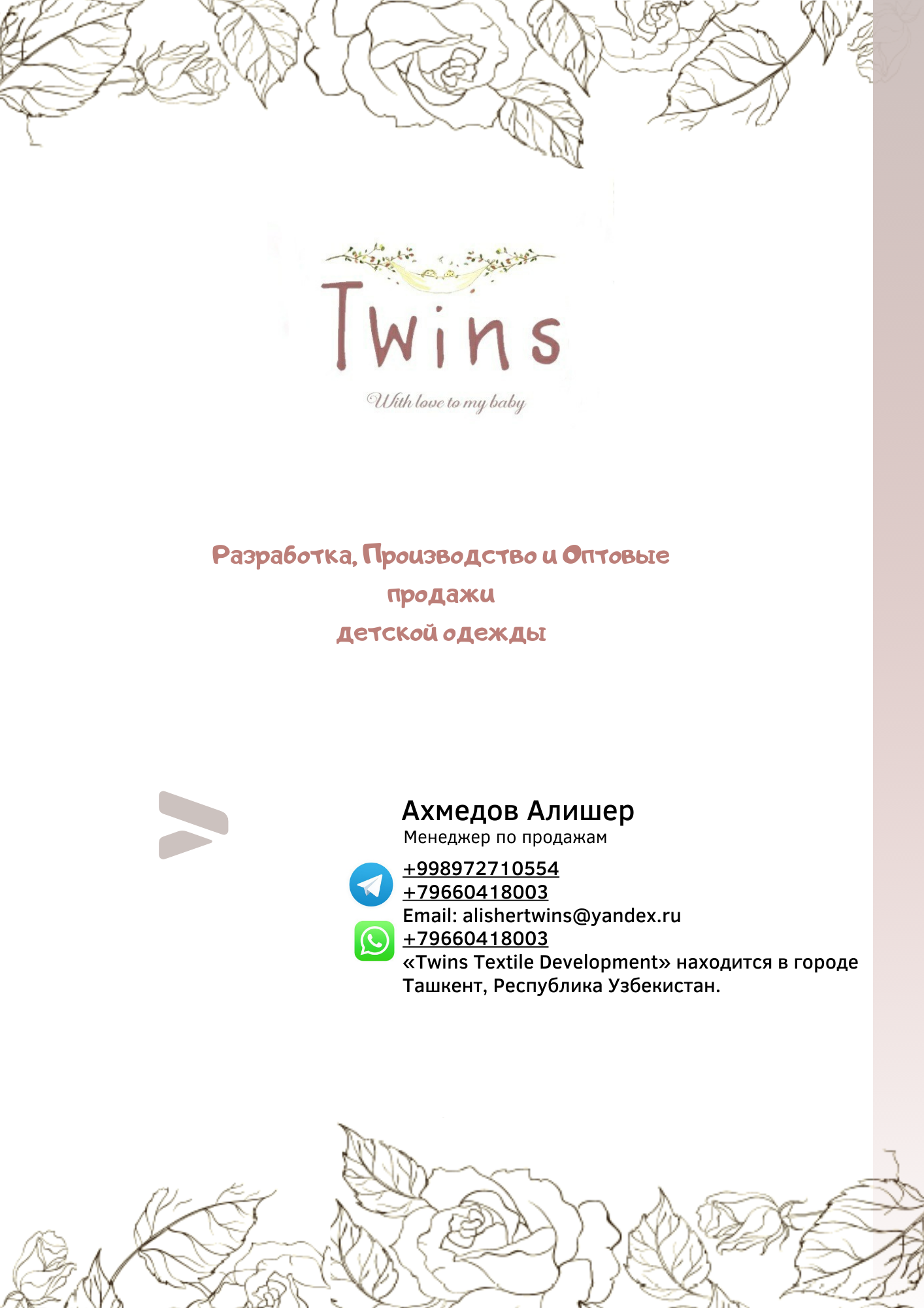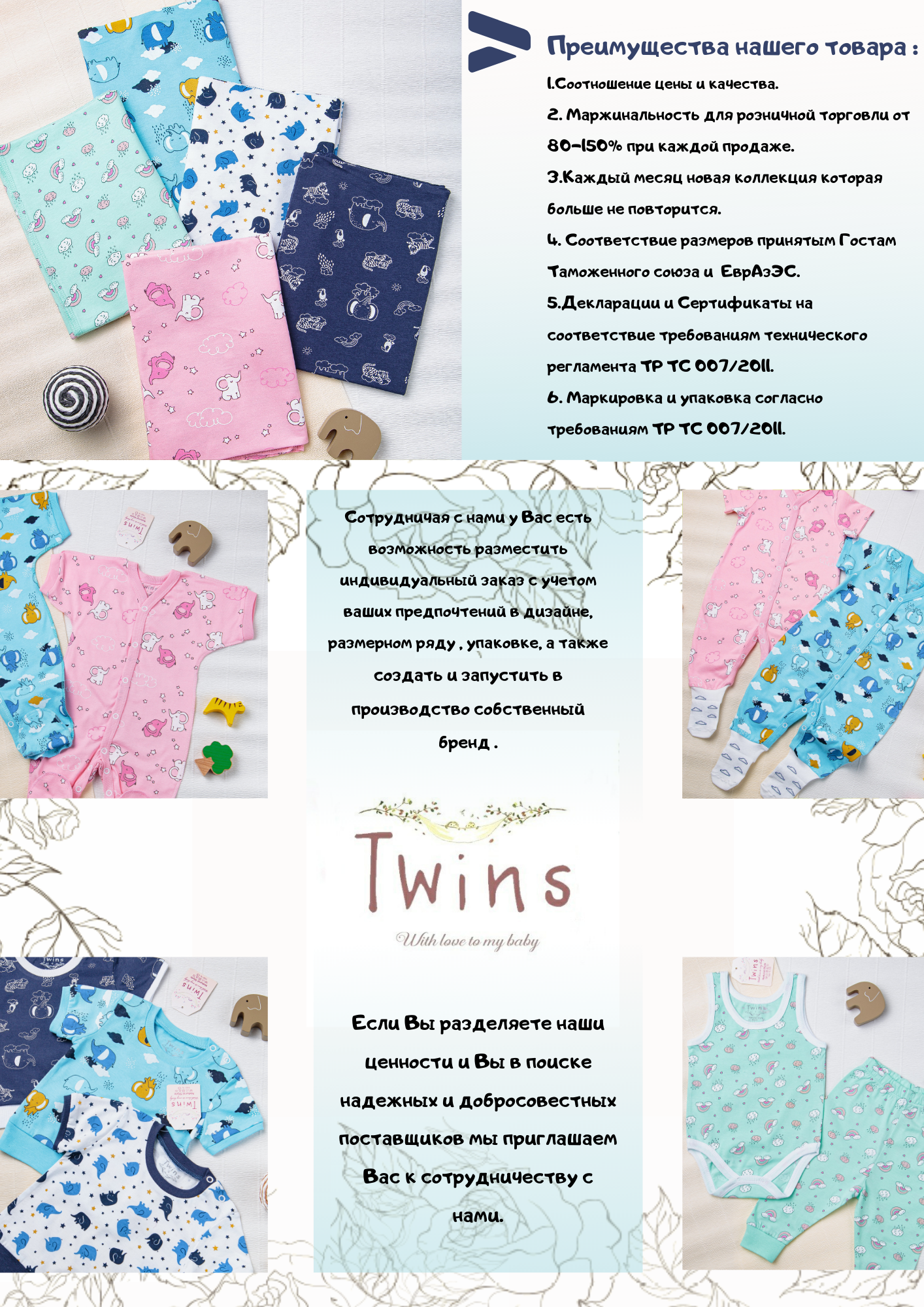 НАША КОМПАНИЯ специализируется на производстве детской одежды. 100% хлопок, позволит чувствовать Вашим малышам комфорт и уют. Сертификаты качества и гигиены, сделают Ваш выбор уверенным и безопасным. Производство находится в г. Ташкенте. Для максимального удобства, в Алмате создан оптовый склад, который позволит Вам, приобретать весь ассортимент производимой нами продукции. Приглашаем Вас к взаимовыгодному и долгосрочному сотрудничеству!
