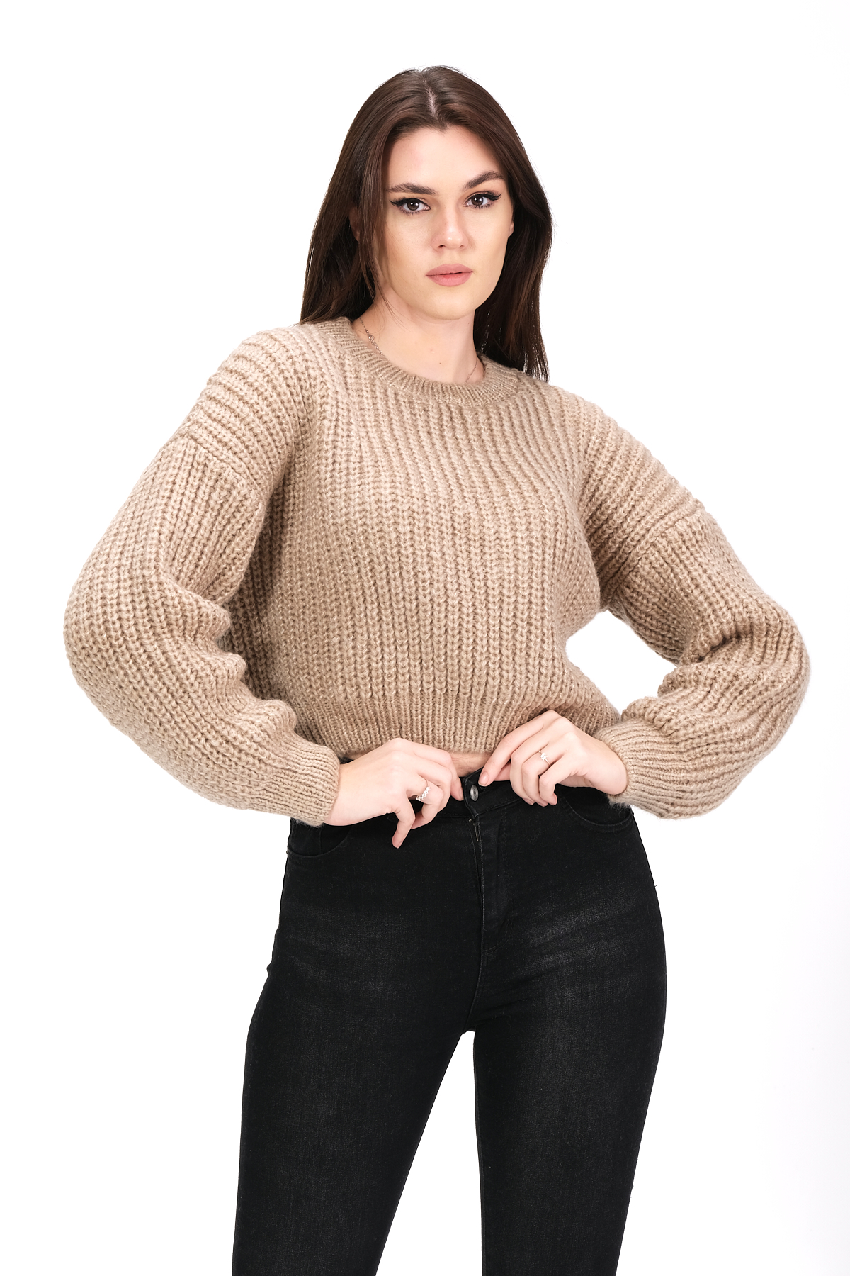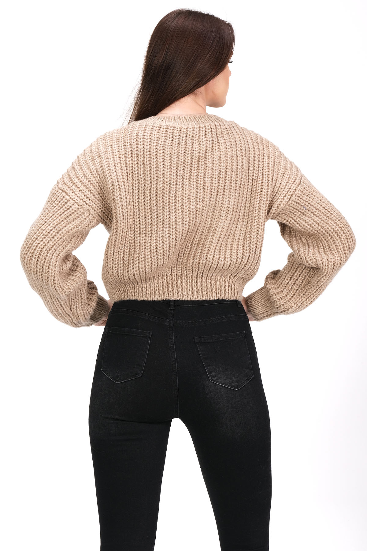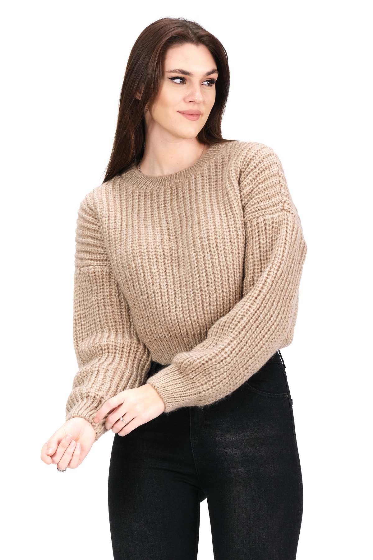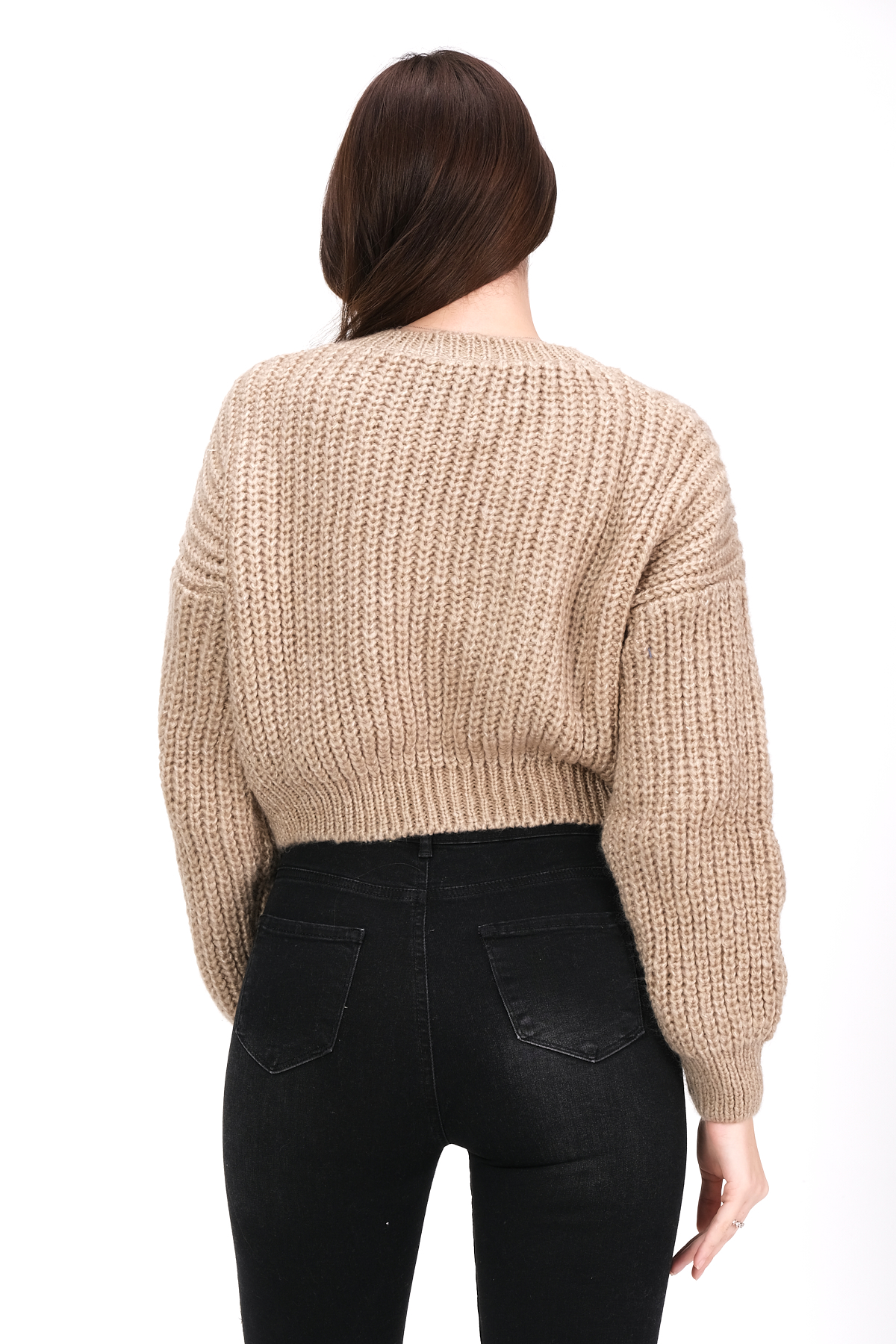 Трикотажный укороченный свитер с круглым вырезом - 74831