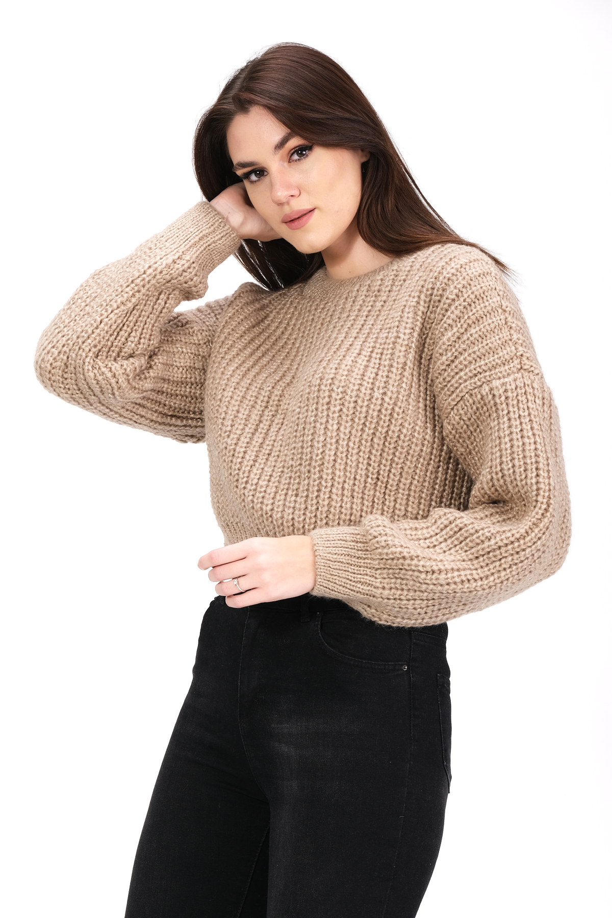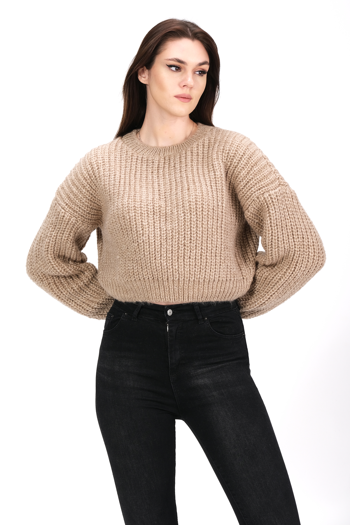 Трикотажный укороченный свитер с круглым вырезом