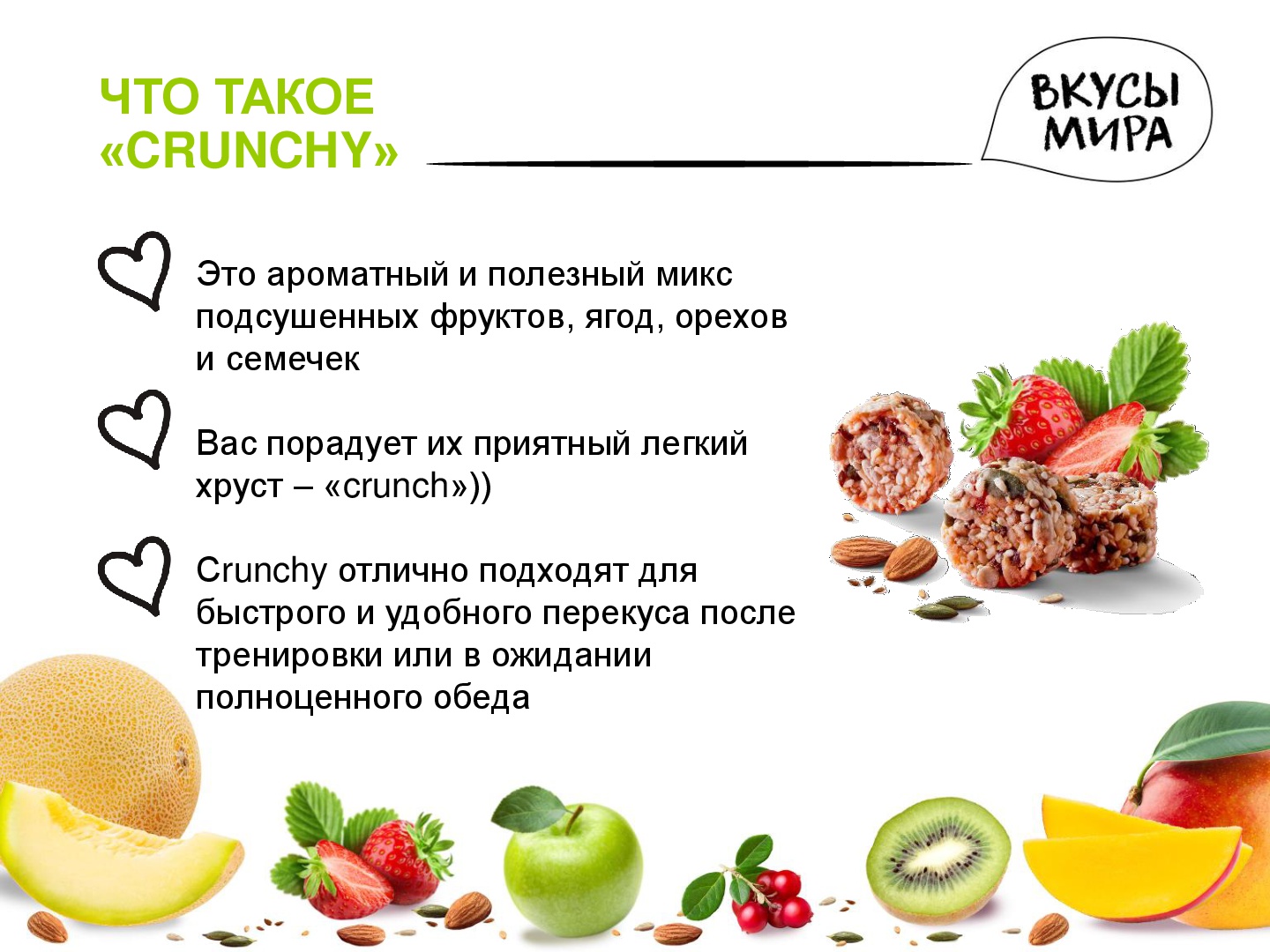 CRUNCHY "Вкусы мира" - ароматный и полезный микс подсушенных фруктов,ягод,орехов и семечек. Вас порадует их приятный легкий хруст - "crunch". Кранчи популярны в разных уголках мира и употребляются с любимыми фруктами или ягодами. Наслаждаться этим вкусным и полезным снэком можно бесконечно.