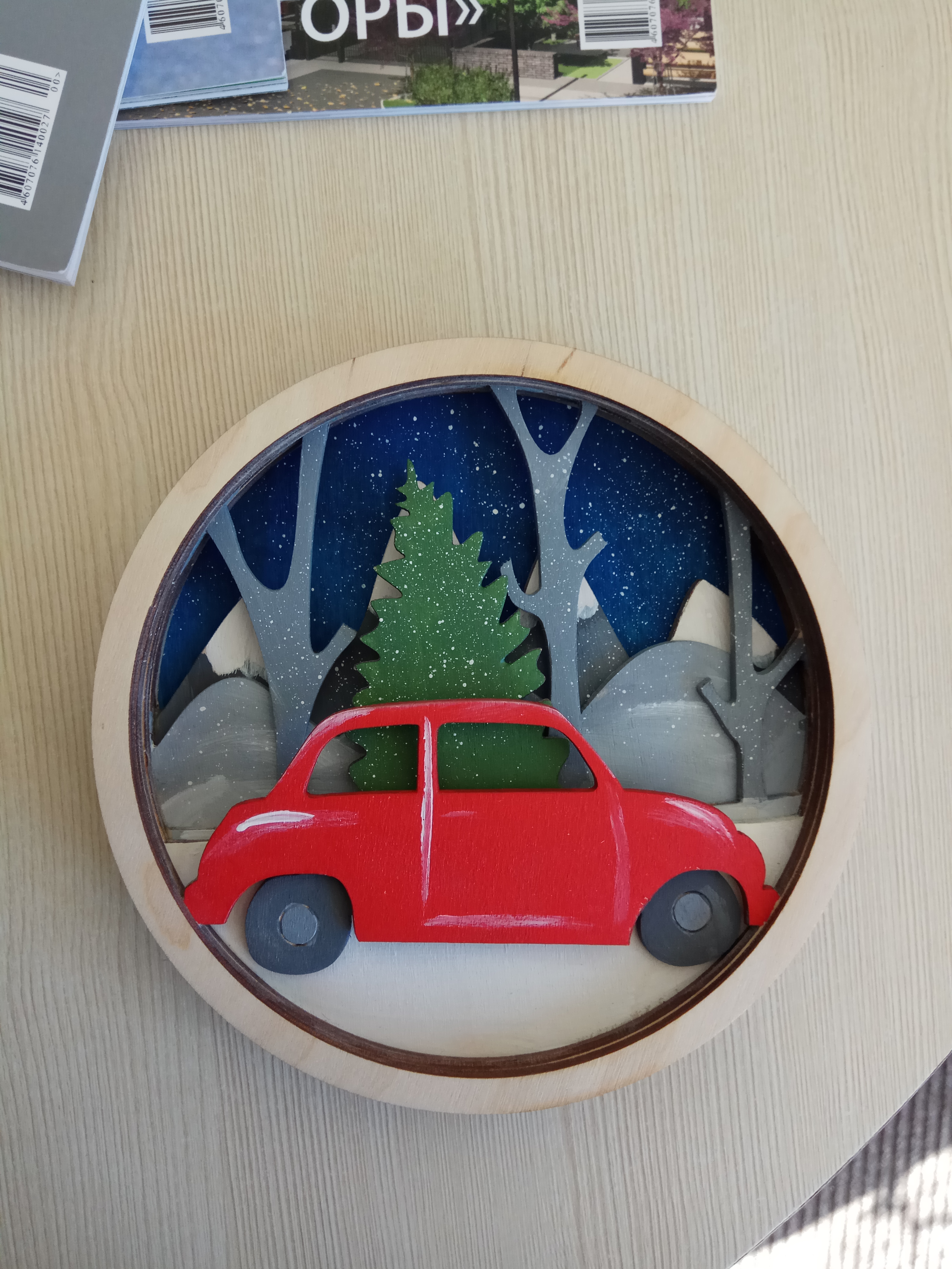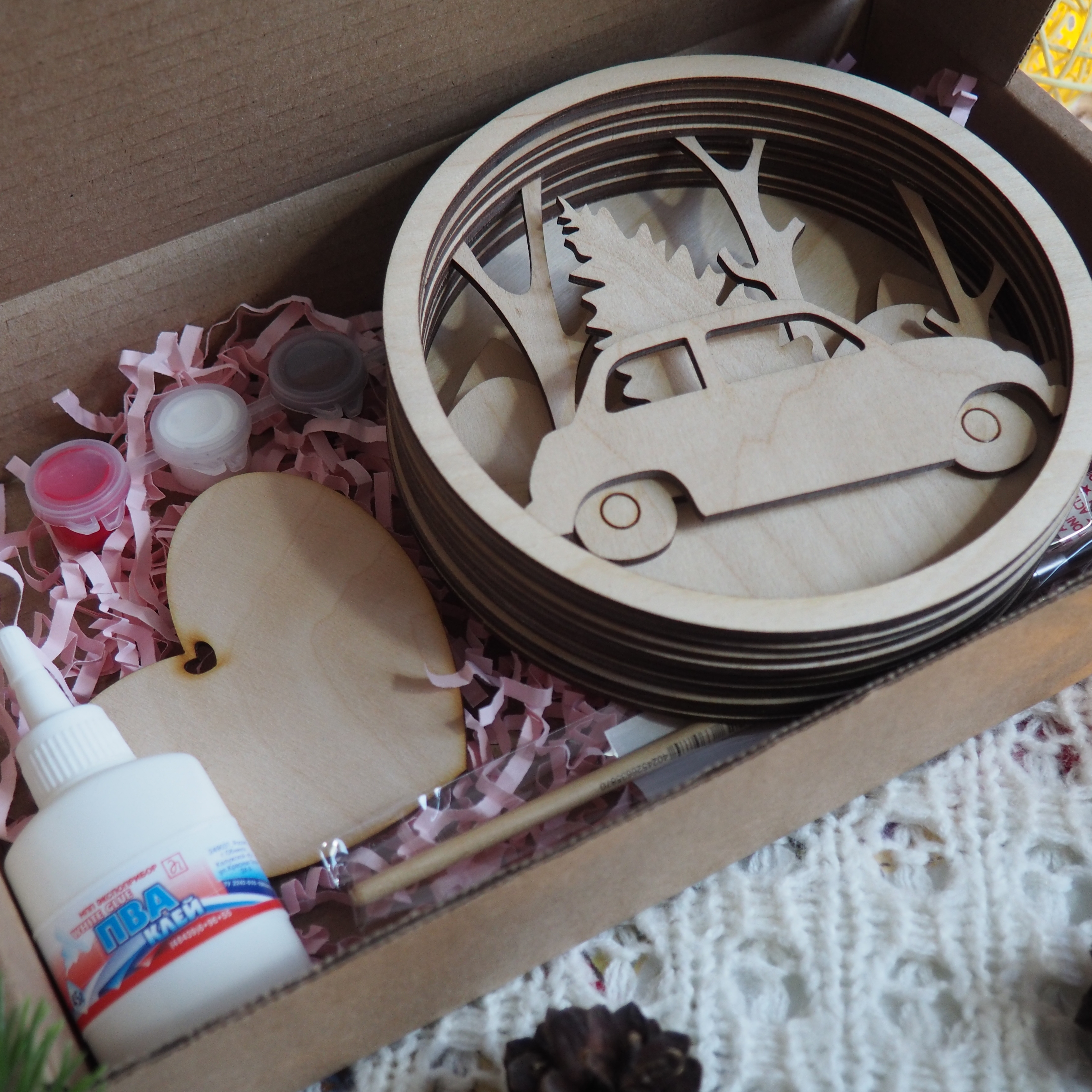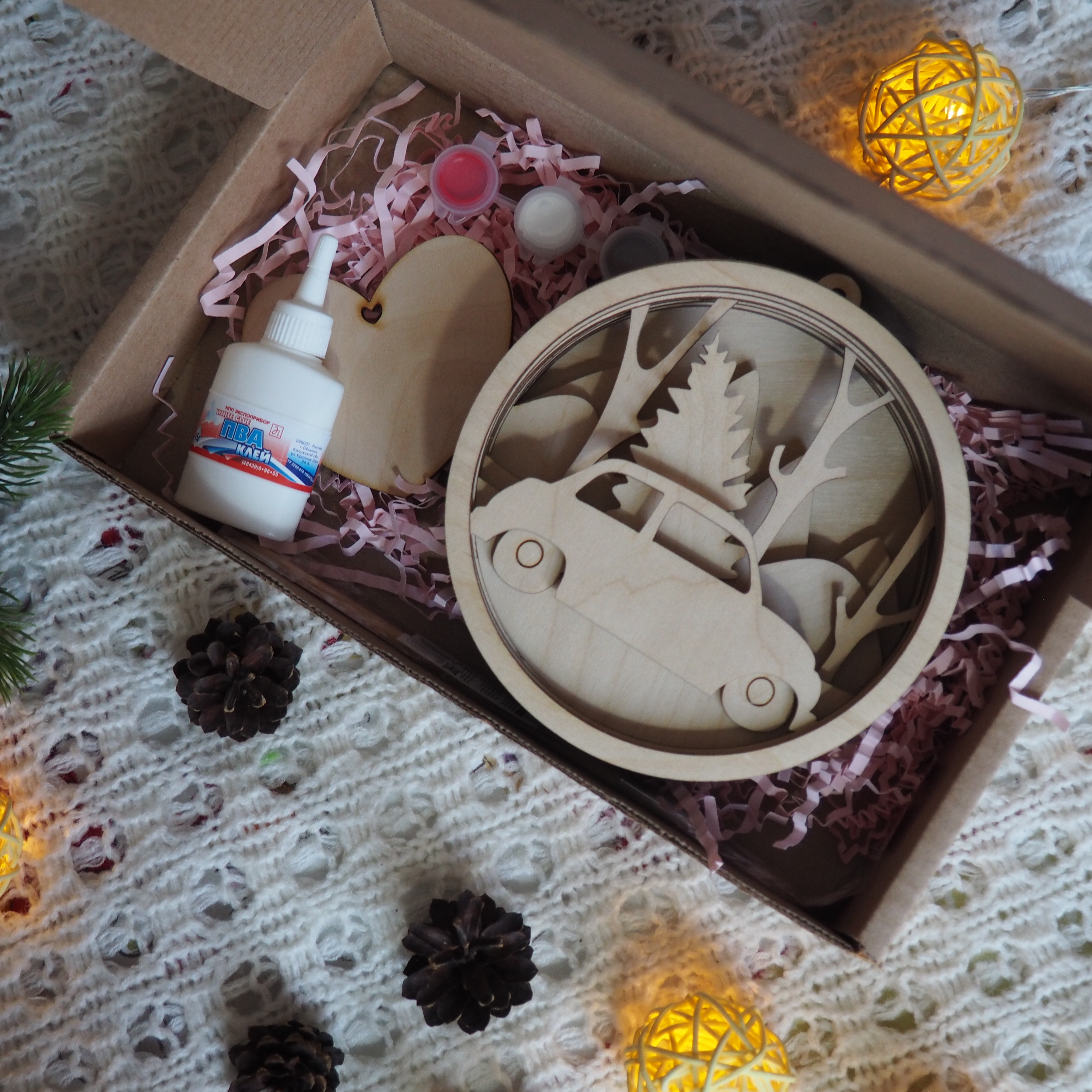 Представляем Вам набор для творчества, которую вы можете раскрасить сами. Отличный способ интересно провести вечер со своим ребенком! Весь набор приходит в разобранном виде, после раскрашивания можно склеить обычным клеем ПВА. Картинка имеет ушко для подвешивания. В набор входит: -6 цветов акриловых красок, -кисть, -клей ПВА. Весь набор красиво оформлен в коробке, поэтому будет отличным подарком для ваших друзей и близких.