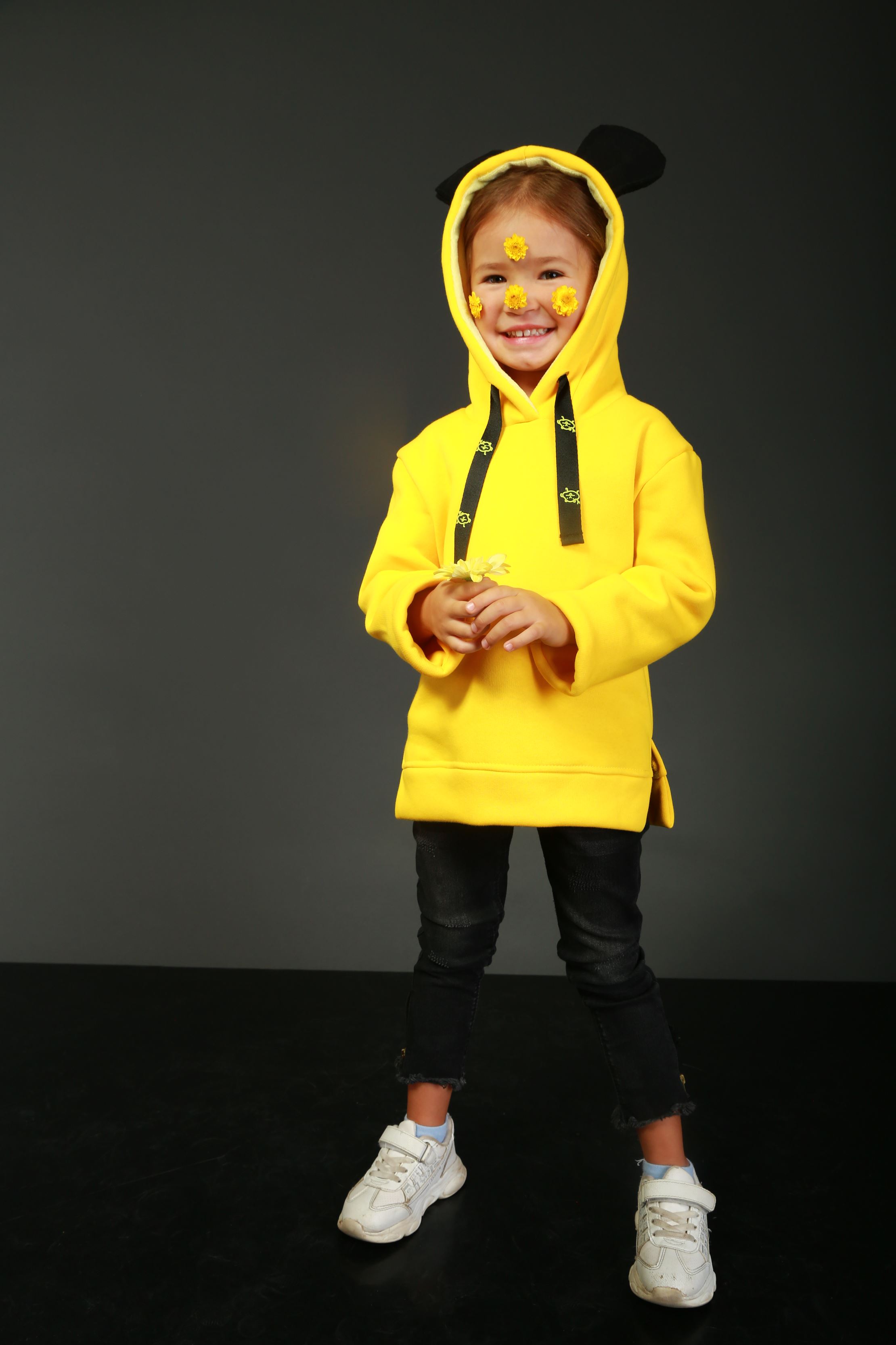 Яркий детский худи Yumster YF.02.07.001 с ушками. Прекрасная модель на осень-зиму. Размерный ряд - для детей от 2 до 8 лет.   Детали: худи желтого цвета на флисе. Глубокий капюшон, декорированный ушками. Внутри капюшона желтая махра. На капюшоне брендированные люверсы и тесьма. Внизу по бокам есть небольшие разрезы.  Состав: 90% хлопок, 10% полиэстер.
