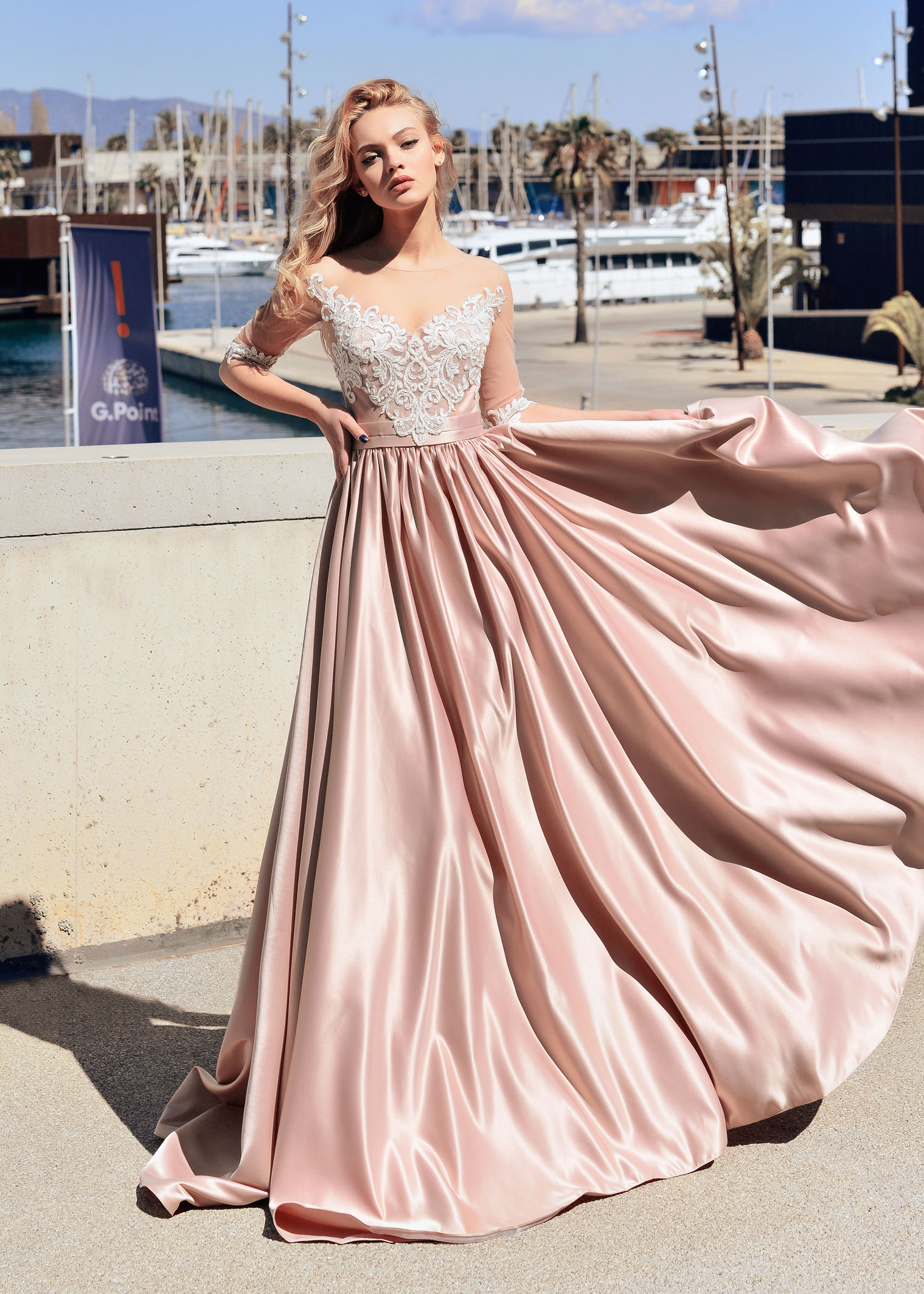 Dantel süslemeli uzun gelinlik. Saten etek, dantel ile üst file.