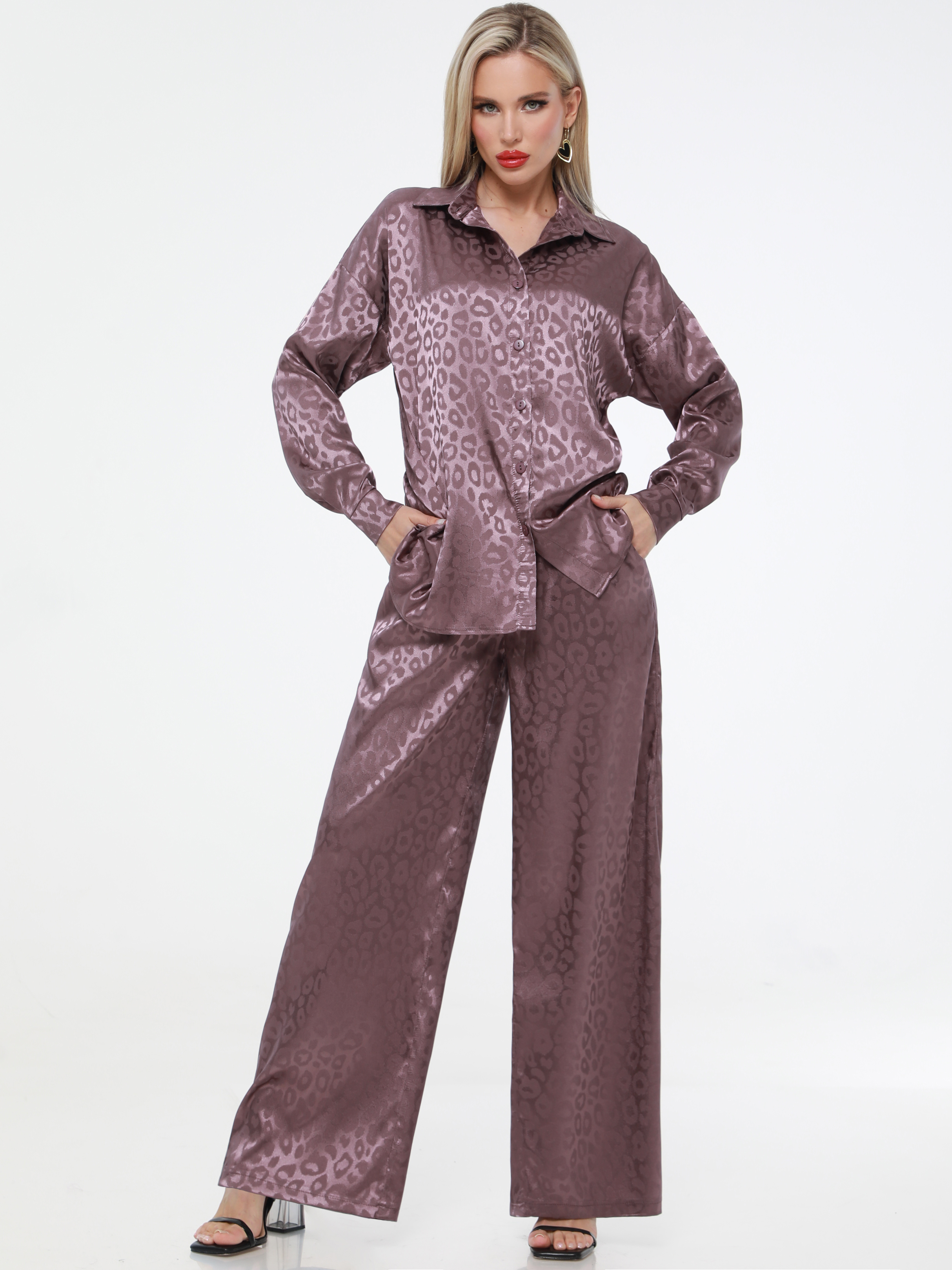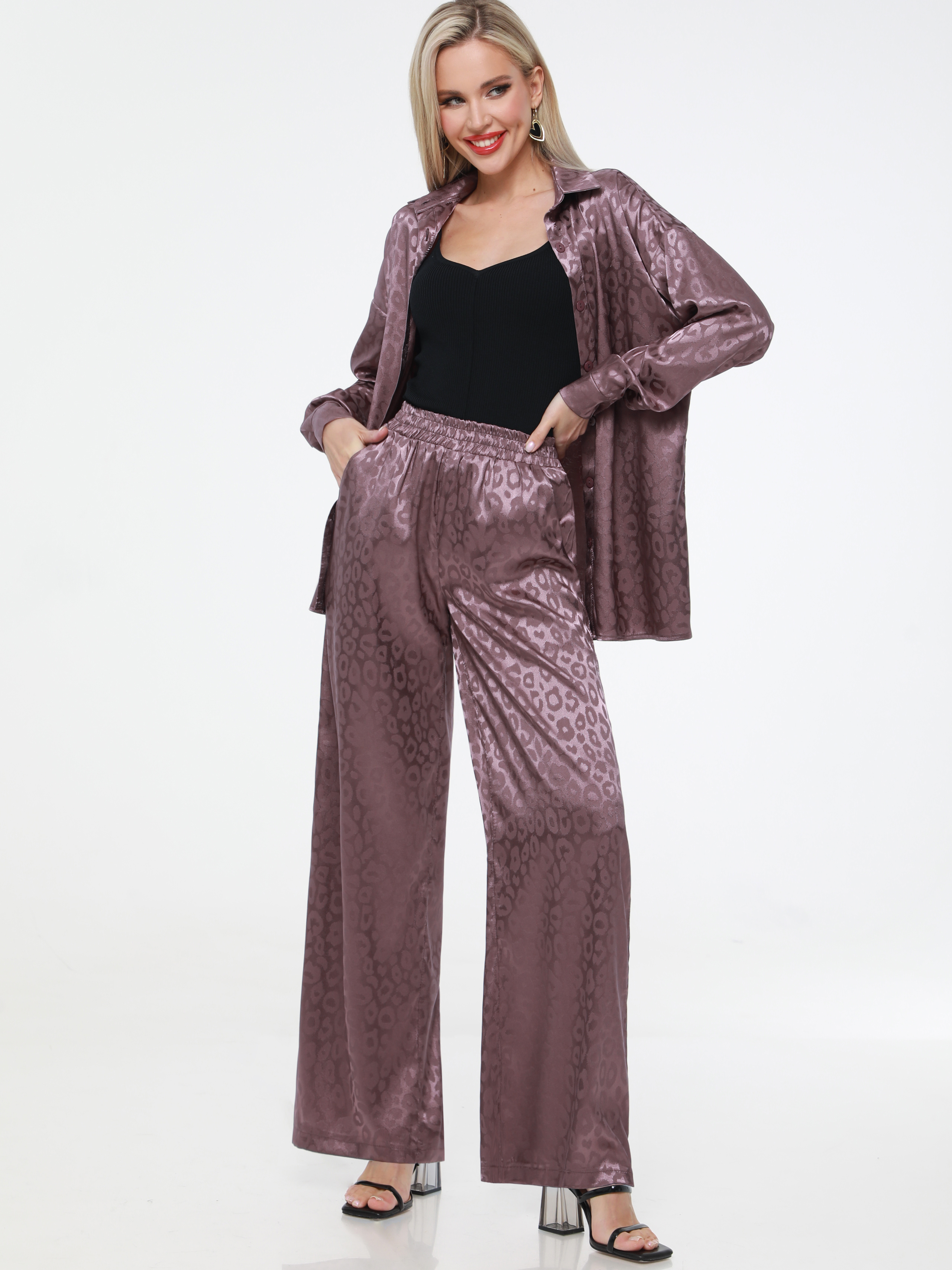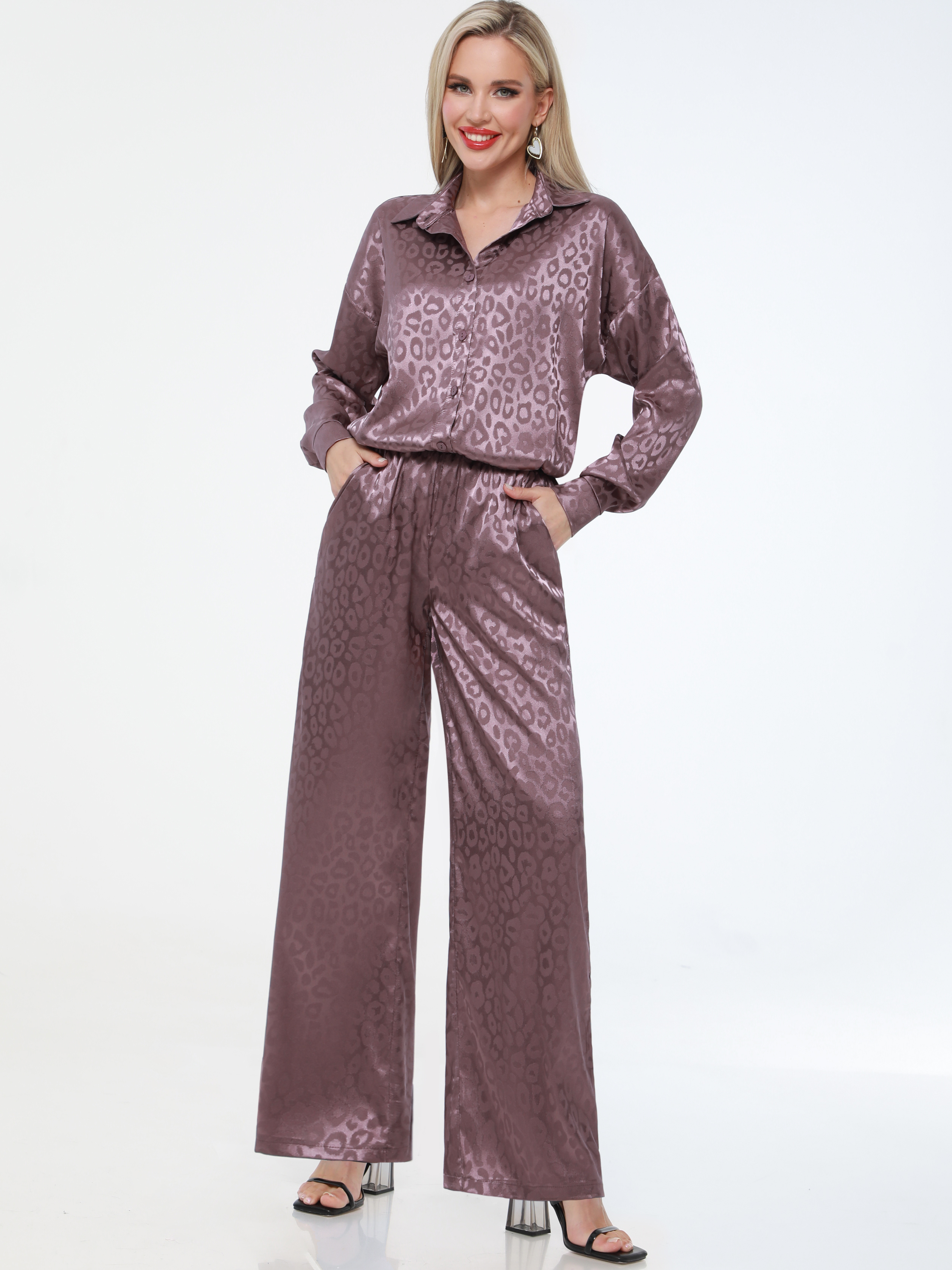 Kadınların hafif ipek takımı bayram akşamları için mükemmel bir seçimdir. Saten iki parça, uzun kollu düğmeli gömlek ve elastik düz paça palazzo pantolondan oluşur. Şık tasarımı onu hem iş hem de akşam, şık ve zarif kılar. Günlük kullanımda bile kendinizi rahat hissedeceksiniz. Güzel, parlak yeni bir baskıya sahip bol, yumuşak bir takım elbise hem uzun hem de kısa kızlara ve kadınlara yakışacaktır. Yüksek kaliteli kumaş seçtik, ince ama yoğun, ipeksi, şık. Yaz/ilkbahar klasiği kadın giyim seti, büyük ve küçük bedenlerden oluşan, her vücut tipine uygun, zayıf ve kilolu, hamile veya hamile anneler için uygundur. Geniş bol pantolonlar evde pijama olarak kullanmanıza olanak sağlar. Zarif, genç, sıradışı klasik, her durumda güzelliğinizi ve tarzınızı vurgulayacak ve her durumda size eşlik edecek benzersiz bir görüntü yaratır - baloda, bir arkadaşınızın düğününde, yürürken ve hatta ofise giderken.