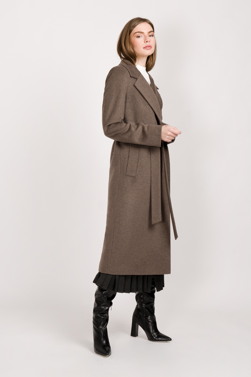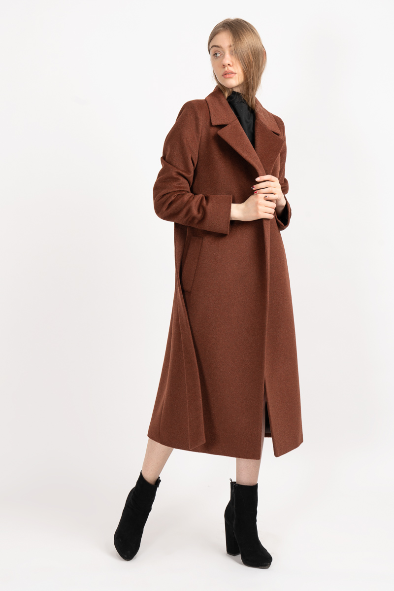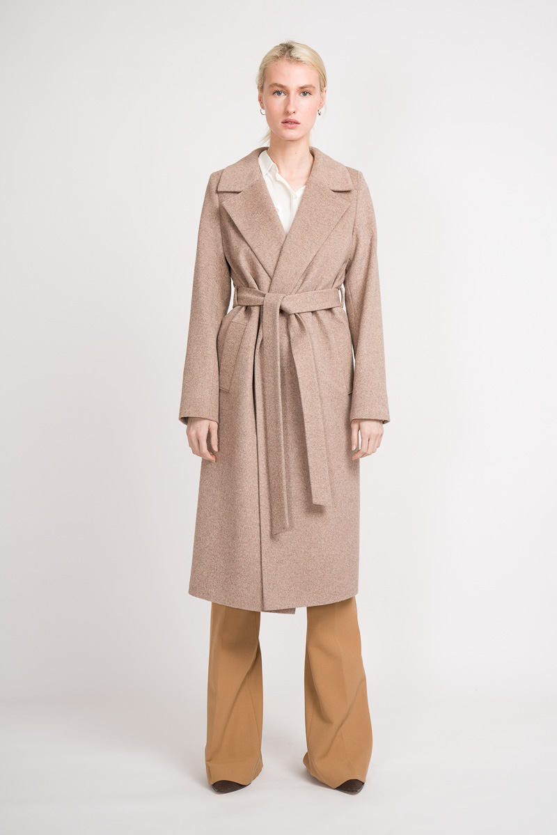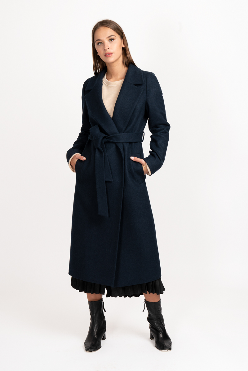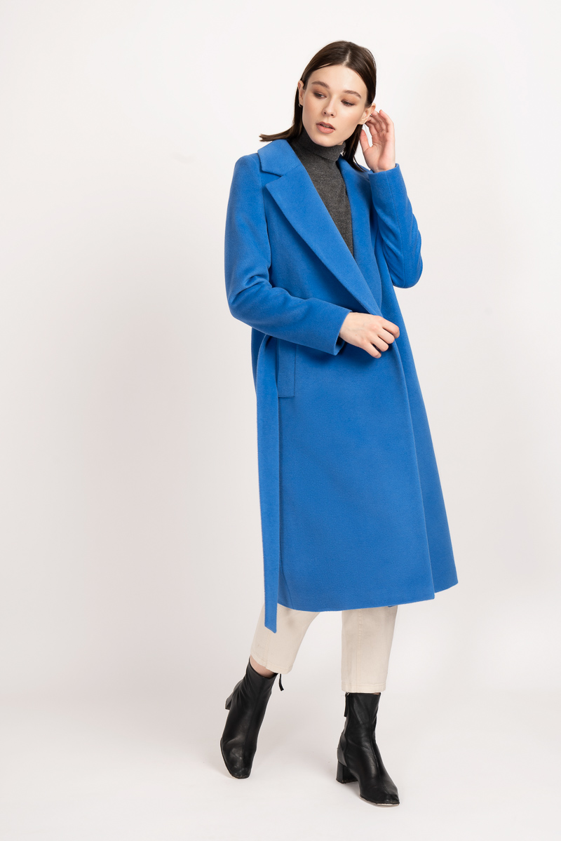Orta uzunlukta ve gereksiz detaylar olmadan ceket sabahlık Kumaşın bileşimi% 60 yün,% 40 polyester.