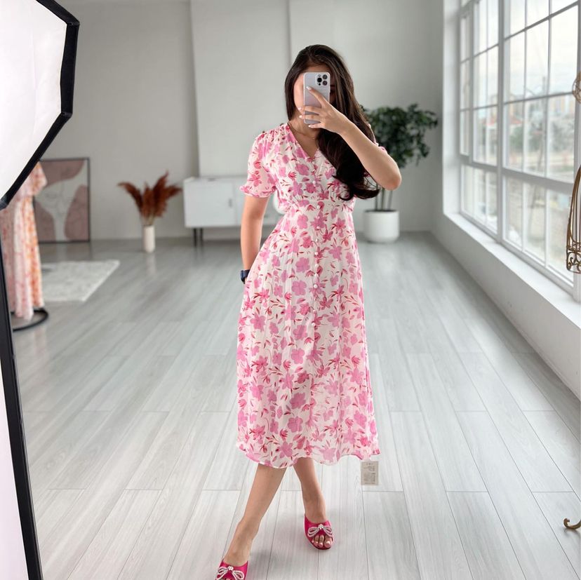 Festival Çiçek Baskı V Yaka Fırfır Yaz Kısa Kollu Günlük Elbise