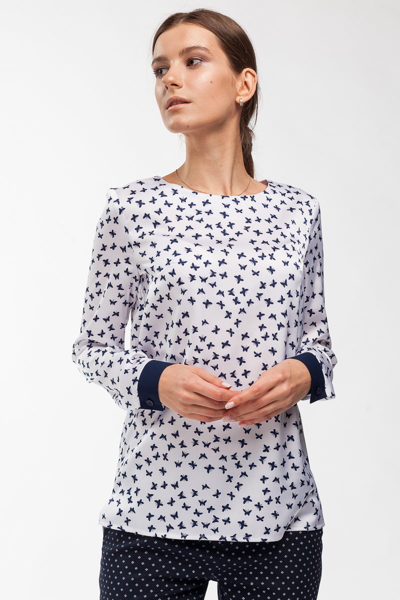 Kadın bluzu 301/35. Renk: süt Raptiye tipi: arka düğme üzerindeki “damla” Desen: mavi kelebekler Fit tipi: gevşek Kol tipi: düğmeli manşet ile uzun Yaka yaka: tekne Ana kumaşın bileşimi:% 95 PE,% 5 viskon Dekoratif eleman: hayır Ürün bakımı : 30 ° C sıcaklıkta hassas yıkama, 110 ° C'ye kadar demir sıcaklığında ütüleme, ağartma, tambur kurutma yasaktır Amaç: her gün, ofis, zarif Sezon: ilkbahar, yaz, sonbahar, kış