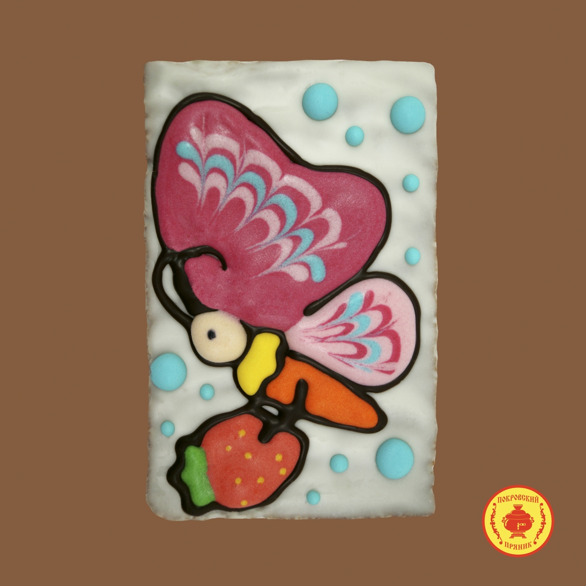 Традиционный Покровский пряник рокрывается шоколадной молочной глазурью и расписывается вручную нашими художниками, при помощи цветной сахарной глазури. Внутрь пряника кладется толстый слой фирменной начинки. Красочные цветные пряники также могут изготавливаться по индивидуальному заказу.