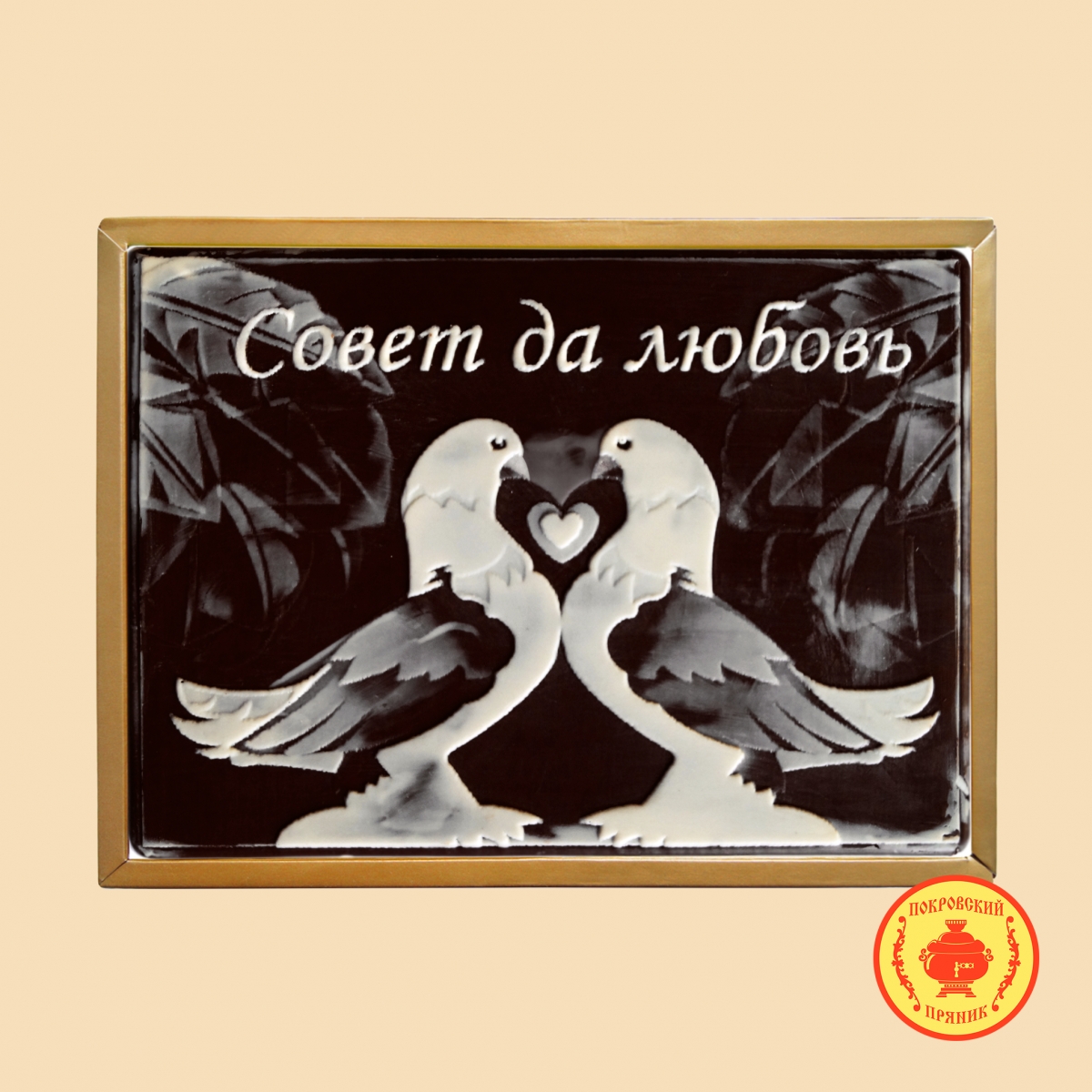 Традиционное тесто, изготовленное и выпеченное по старинным русским рецептам, покрывается слоем шоколадной глазури «Премиум» класса на которую наносится тематический рисунок, а Внутрь толстый слой начинки из вареной сгущенки и грецких орехов, такой характерный для Покровского пряника.