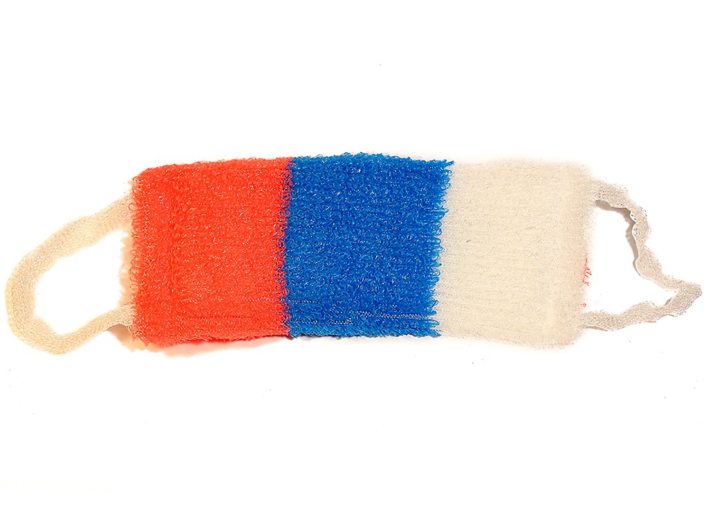 Патриотическая мочалка из полипропиленовых нитей. Она очень мало весит, почти невесомая. Аккуратно положите её в пакет и берите с собой куда угодно – бассейн, сауна, баня или фитнес-клуб. Она прямоугольной формы и это способствует равномерному растиранию всех частей тела. Две ручки, которые расположены по обе стороны, помогают легко доставать самые труднодоступные части тела. Практична для полных людей и для тех, у кого проблемы с плечевыми суставами. Мочалка достаточно жесткая чтобы отлично вымывать тело от грязи, пыли и пота. При этом она отлично гнется благодаря эластичному материалу.